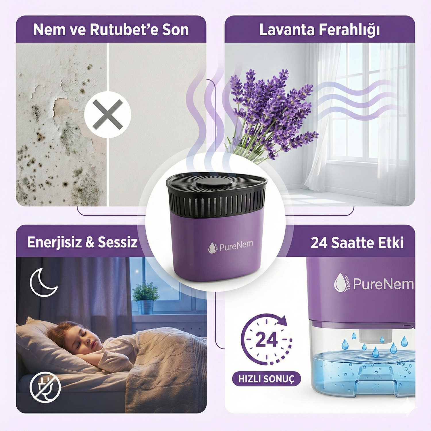 Sadece nemi almakla kalmaz, kötü kokuları gidererek evinize taze lavanta kokusu yayar.